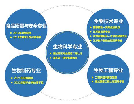 2012年,生物科学类专业(生物科学、生物技术、生物工程)被评为江苏省重点专业类。生物科学专业2020年通过师范专业国家二级认证,2021年获江苏省一流专业;生物技术专业2010年获教育部“十二五”专业综合改革试点项目,2015年获江苏省品牌专业(A类),2017年入选教育部《中美》“1+2+1”双学位项目,2019年获首批国家一流专业建设点,2020年获江苏省品牌专业二期项目资助,2022年获江苏省高校国际化人才培养品牌专业、江苏省产教融合型品牌专业。生物工程专业2019年申请工程教育专业认证并获教育部正式受理,2022年通过全国工程教育专业认证,是全国师范类大学中第二家通过的生物工程专业。