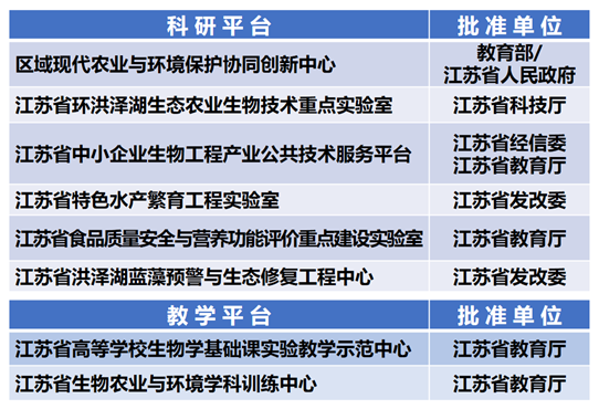 建有省级以上科研、教学平台8个。其中,“江苏省环洪泽湖生态农业生物技术重点实验室”是我省苏北地区第一个省级重点实验室,连续两次以“良好”等第通过省科技厅绩效评估;“区域现代农业与环境保护协同创新中心”2014年获江苏省人民政府立项,2016、2020年连续两次在全省绩效评价中获“A”等次,2022年获批教育部省部共建协同创新中心,《人民日报》《中国教育报》等媒体先后报道;江苏省洪泽湖蓝藻预警与生态修复工程中心为我国首家洪泽湖水环境遥感监测实验室,已连续多年编制发布《洪泽湖水环境卫星遥感监测年报》,被科技部纳入国家地球科学数据共享平台,为地方环保部门科学决策提供了科学依据。