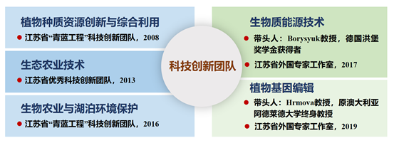 拥有“植物种质资源创新与综合利用”“生态农业技术”“生物农业与湖泊环境保护”等省级科技创新团队3个。建有江苏省科技厅外国专家工作室2个,其中“生物质能源技术”团队带头人Borysyuk教授为德国洪堡奖学金获得者; “植物基因编辑”团队带头人Hrmova教授原为世界百强大学终身教授,已先后入选“江苏省外专百人计划”、国家科技部“高端外国专家”。