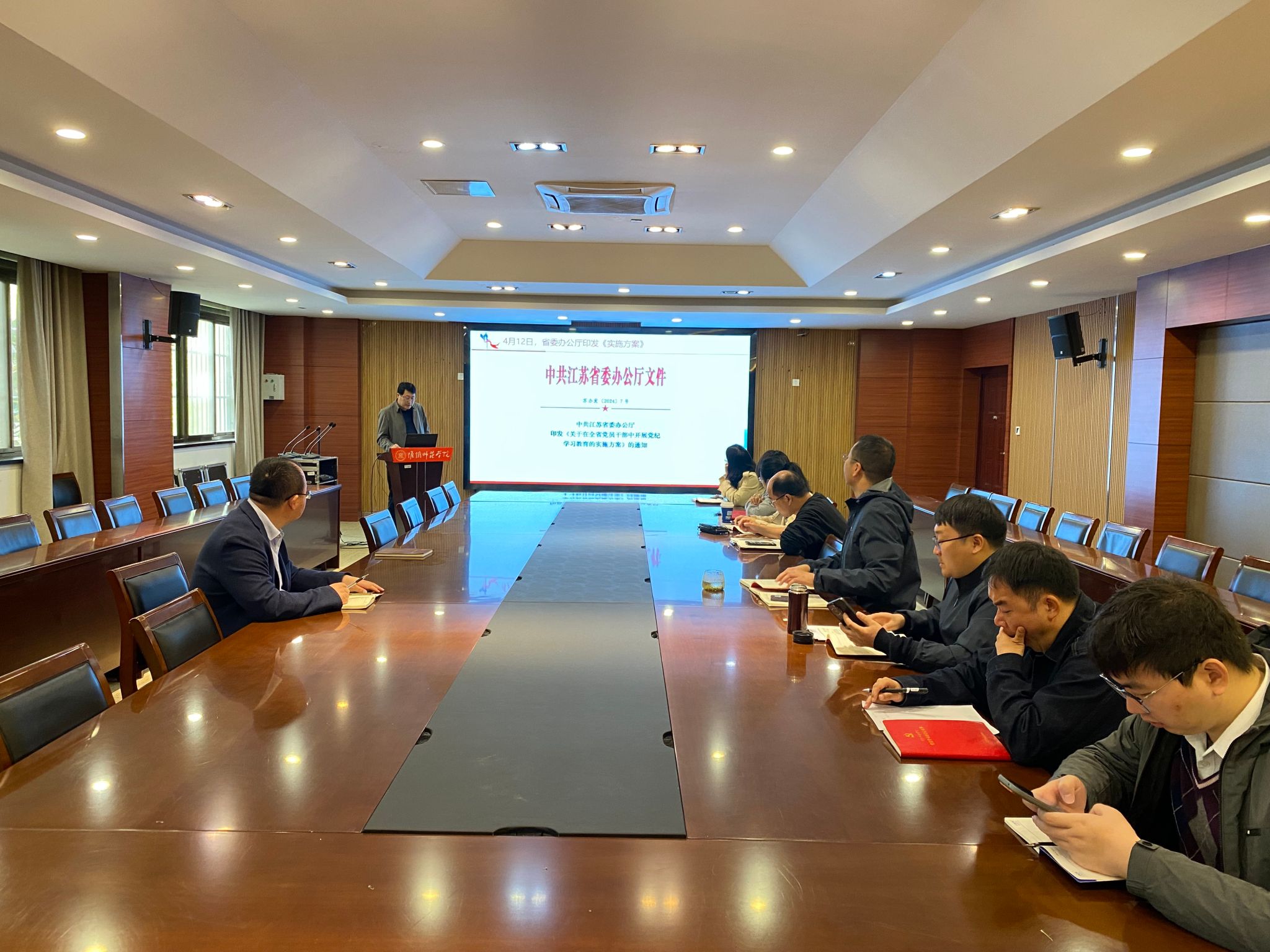 殷占兵传达上级党纪学习教育文件精神,文件指出要确保每项活动落到实处,强化对条例的解读和培训,推动党员干部自我剖析,认真对照检视以及对党纪学习教育有关问题做出答复,促进党员干部完善理论学习,切实把准正确方向、把握精髓要义、把牢目标要求。