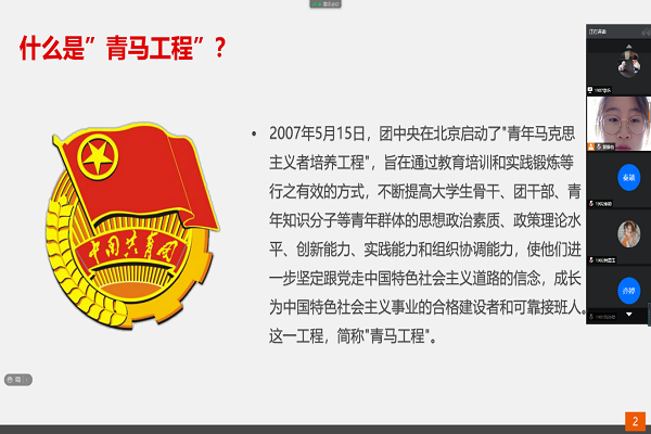 会议分为学干工作经验分享、青马工程思想学习、思想交流三部分内容。会议伊始,团委宣传部长黄静怡就团委基本工作、新闻宣发、新媒体使用等进行了工作经验的简单分享。随后,黄静怡又带领员工进行了青马工程发展历史及其意义的简单了解,她强调:“在各种思想文化相互激荡的环境中,广大青年思想活动的自主性、选择性、多变性、差异性明显增强。在此背景下,能否培养和造就一大批用马克思主义中国化的最新成果武装起来的青年马克思主义者,将关系到我国改革开放伟大事业的成败,在校老员工开展青马工程具有十分迫切与必要的意义。”最后,多名团委学干参与青年马克思主义、习近平新时代中国特色社会主义思想相关理论的研讨,大会进行顺畅,反响热烈。