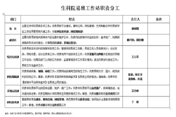 生科院易班工作站建立了站长、副站长、综合行政部、网站编辑部、采编运营部、网络技术部等多个职能部门,专人管理,各司其职。