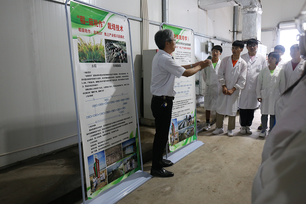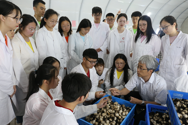 在江苏省万佳鑫菌业科技有限公司的种植大棚内,实践团王新风老师现场指导教学活动。他指导员工观察稻菇的生物学形态,引导员工分析其生长环境,并比较不同类别的稻菇、分析生物形态残缺的稻菇,让员工思考对应的生物培养技术及相关问题,实践团成员深受启发,纷纷点赞。