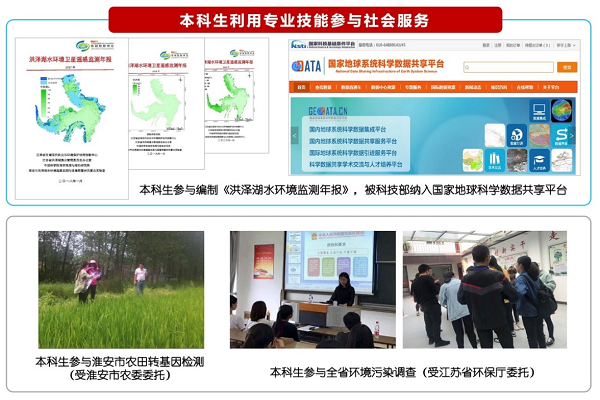 师生连续多年编制《洪泽湖水环境监测与蓝藻预警年报》,被科技部纳入国家地球科学数据平台,并在相关部门管理决策中得到应用;多次参与淮安市农田的转基因检测普查,并作为《转基因农产品检测技术》特色课程和员工技能训练的重要内容,也为当地农业执法部门提供了参考。
