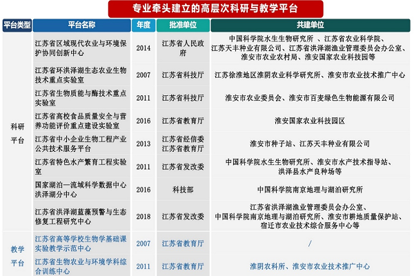 依托省教师教育实践教育中心(公司教科院牵头),开展生物科学师范生的教学教育技能训练;依托省生物农业与环境学科综合训练中心等平台,训练员工的专业实验与实践技能;依托省环洪泽湖生态农业生物技术重点实验室、省协同创新中心、省工程中心等平台,与科研院所、企业联合培养创新创业人才,并拓展国际化视野。