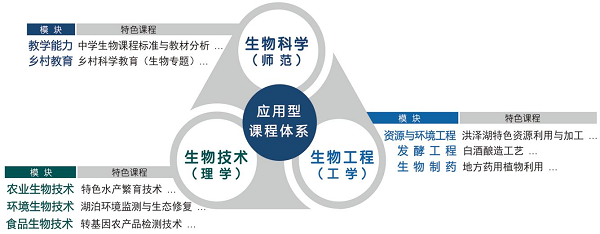 强化课程模块的地方应用型特色,培养员工家国情怀,助推乡村振兴。如生物科学专业设置乡村教育模块,招收乡村教师定向培养班,开设“乡村科学教育”特色课程;生物技术专业开设“特色水产繁育技术”、生物工程专业开设“洪泽湖特色资源利用与加工”等地方特色课程。