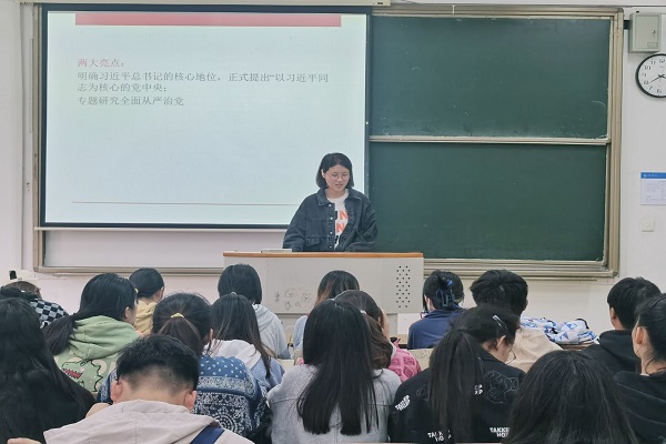 活动由团支书陈佳丽主持,全体同学参加。会上首先由团支书给大家介绍了十九届六中全会召开的背景与意义。随后为大家详细解读了十九届六中全会会议精神,提到会议的两大亮点,一是全会明确习近平总书记的核心地位、正式提出“以习近平同志为核心的党中央”;二是专题研究全面从严治党。同学们认真学习并不时低头做笔记。