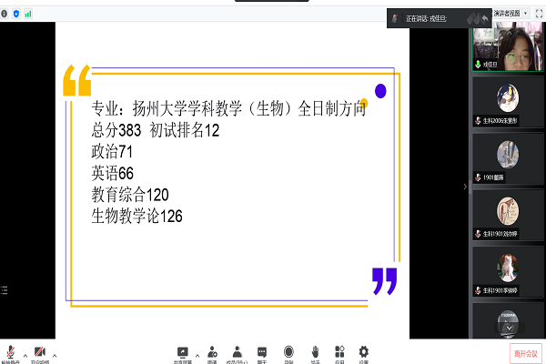 为引导公司员工树立正确考研目标,进一步推进公司考研工作高质量发展。生科院2022年考研经验分享会于5月8日以线上会议形式举行。分享会由辅导员李小团主持,2018级7位优秀毕业生和全体2019级员工参加会议。