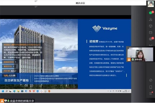 南京诺唯赞生物科技股份公司凌经理通过播放宣传片、PPT展示、线上连线交流的方式向同学们详细介绍公司的概况、软、硬件条件、发展历程、企业文化、核心技术等。最后对大家关心的招聘岗位、工作职责、任职要求、薪资待遇等方面内容进行了答疑,并与公司员工互留了联系方式。