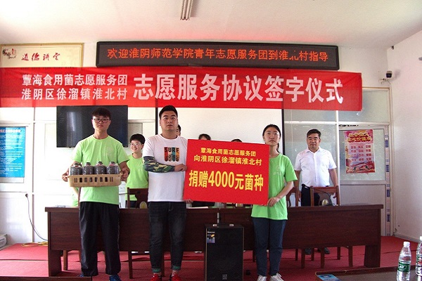 实践团与淮北村书记签订服务协议,并捐赠给徐溜镇淮北村价值4000元的草菇菌种,奠定了长期科技支农的基础,使当地农民快速掌握培育方法的同时也有效地宣传了科学栽培食用菌的重要性与优越性。